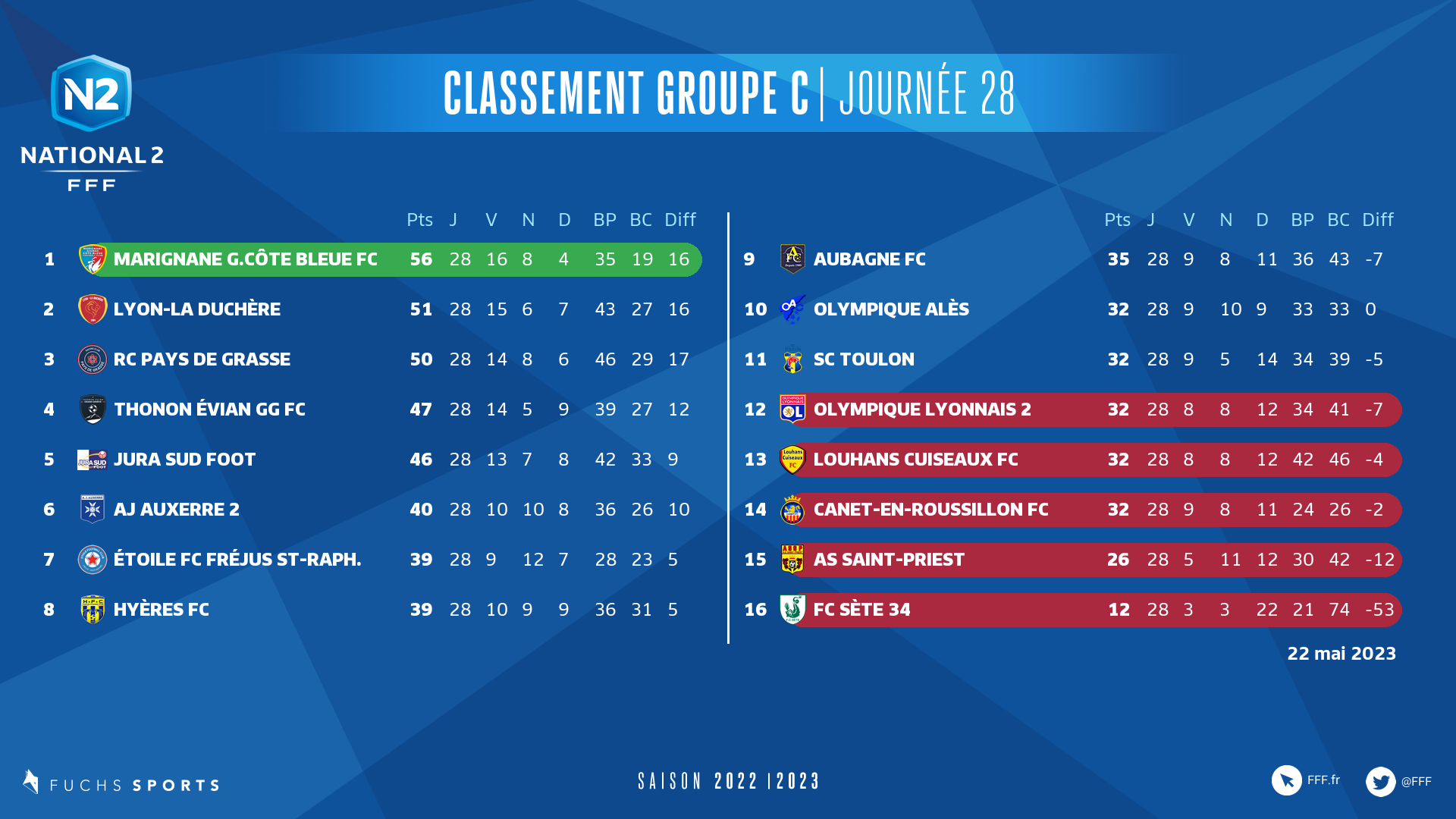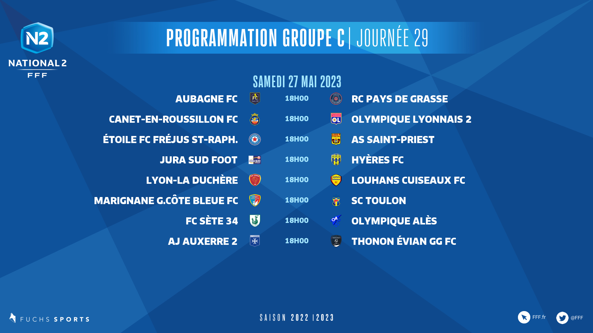 Sur le site de la FFF les enjeux du groupe C pour cette 29ème et avant-dernière journée, "Marignane-Gignac a un pied en National et pourrait assurer son accession à l'étage supérieur samedi en cas de victoire à domicile sur le SC Toulon, pas encore sauvé. Un nul (et peut-être même une défaite) pourrait être suffisant en cas de contreperformance de ses poursuivants, Lyon-La Duchère et Grasse qui défieront Alès et Jura Sud. Si l'AS Saint-Priest a besoin d'un miracle pour se maintenir (à savoir deux victoires sur ses deux derniers matches conjuguées à des défaites de tous ses rivaux), les autres relégables sont encore inconnus. Et pour cause : Alès, Toulon, l'OL B, Louhans Cuiseaux et Canet RFC sont à égalité de points (32) à deux journées du terme ! Aubagne (9e, 35 points) n'est pas encore sauvé et jouera une finale contre Louhans Cuiseaux."